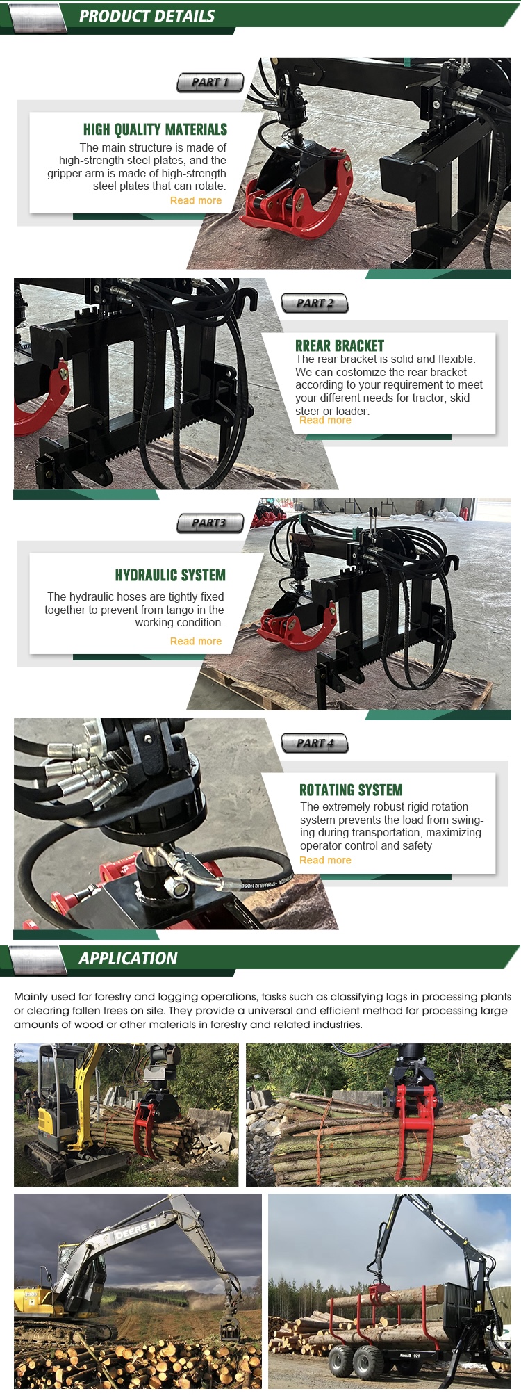 ProductLog haulerModelLH-102Grip area0.21m2Max open2500mmMax Lifting capacity1800KGRotator3tonLinkageCatⅡ&Euro-tractor frontMax pressure20MpaTractor50-90HpWeight240kg